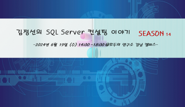 6월 중순에 SQL Server 컨설팅 이야기 시즌14를 진행합니다, 컨설팅 사례로 배우는 실무자들을 위한 특강입니다. 중요 내용은 아래를 참고하시고 많이들 오셔서 지식, 정보, 경험을 함께 나누는 시간되시길 바랍니다. 기타 상세 정보는 아래 등록 링크의 내용을 참고하세요. 일정: 2024-06-19 (수), 오후 2 ~ 6시(4시간) 장소: 모두의연구소 강남캠퍼스 등록: https://www.onoffmix.com/event/301333 중요 내용: tempdb 파일 or Log 파일 용량 증가 TokenAndPermUserStore 캐시 대량 증가 MEMORYCLERK_SOSMEMMANAGER Windows 가용 메모리 부족 볼륨 유지 관리…
